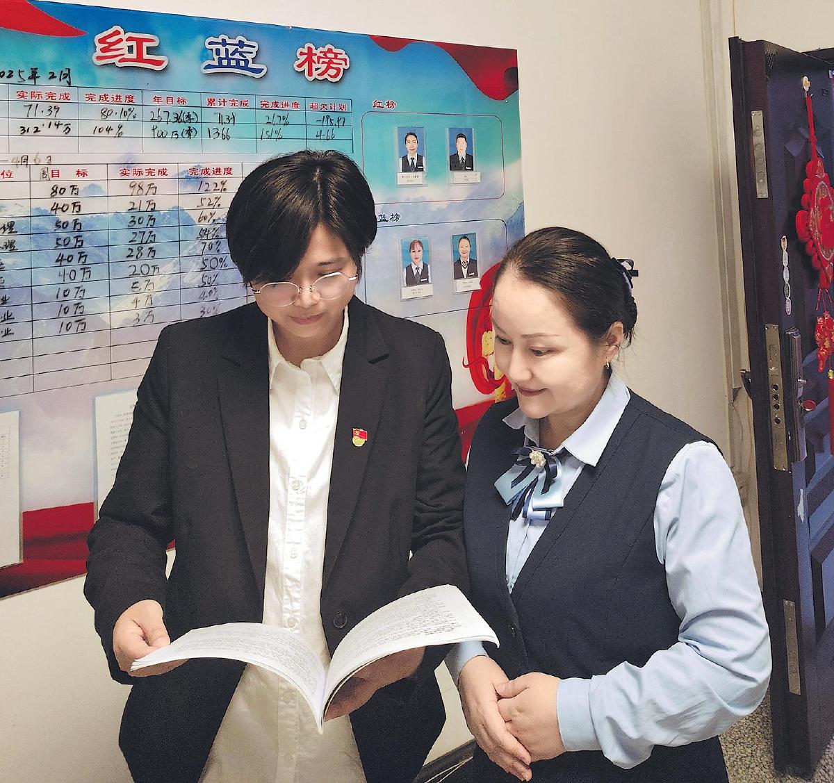 吳麗(左)在網(wǎng)點(diǎn)開展績效面談。